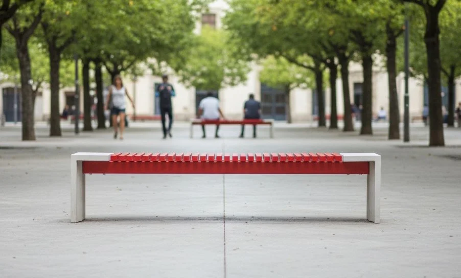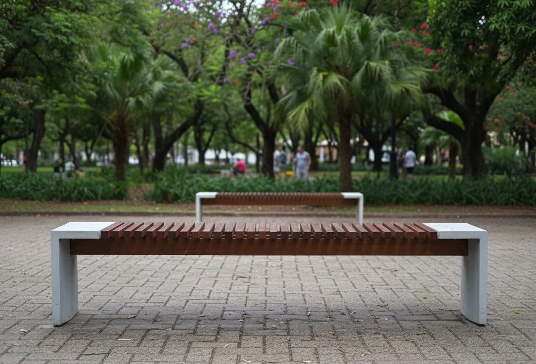 Um banco de desenho ortogonal com pés em concreto e assento em madeira ripada, podendo ser mantida natural ou pintada de diversas cores. Opção com e sem encosto.