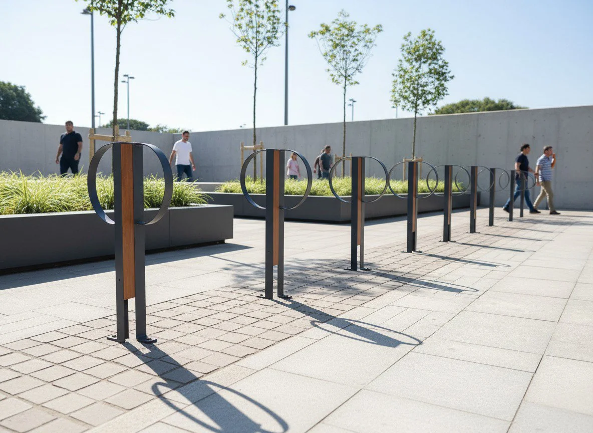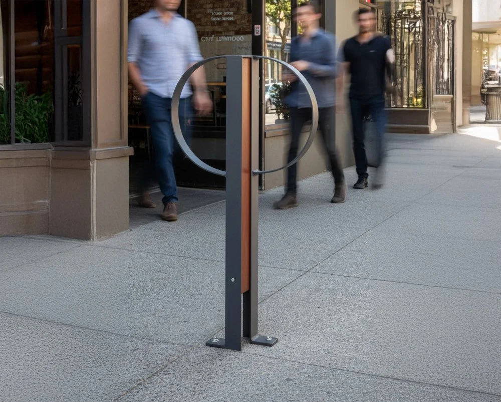 Esse elegante bicicletário em estrutura de aço e detalhe em madeira comporta até duas bicicletas, fixação da trava se dá nos arcos laterais. Recomenda-se espaçamento de 75cm entre módulos.