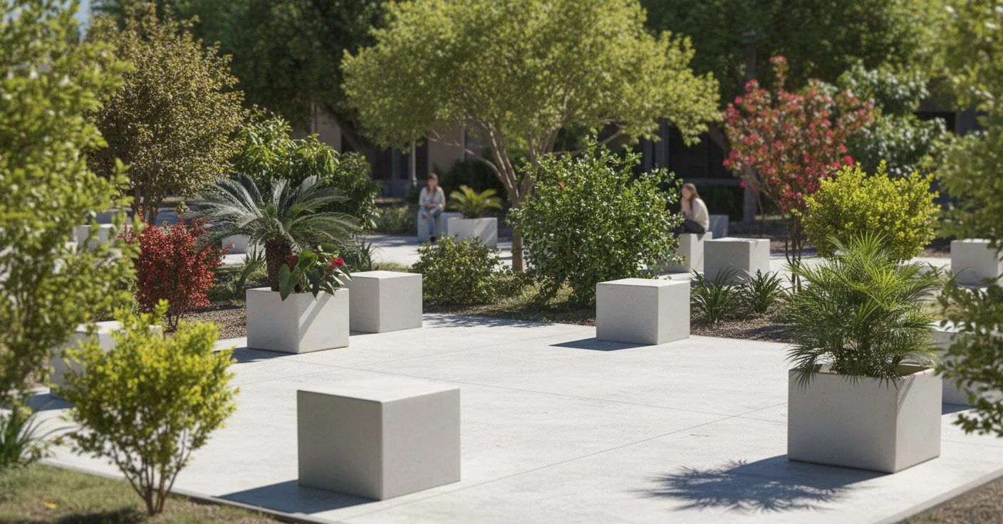 EXEMPLO DE COMPOSIÇÃO UTILIZANDO BANCOS E FLOREIRAS DE DIFERENTES TAMANHOS E ALTURAS