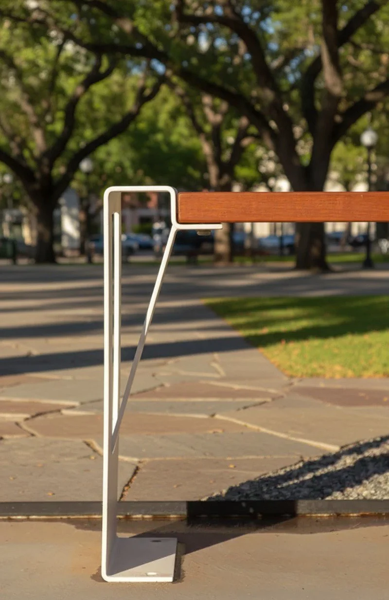 Banco em pés de aço cortado a plasmas e dobrados. A rigidez da estrutura se resolve nela mesma através de dobras e conexões. Em evidência fica a beleza da madeira Jatobá. O encaixe entre o os pés e o assento ficam invisíveis enfatizando a madeira e evitando infiltrações.