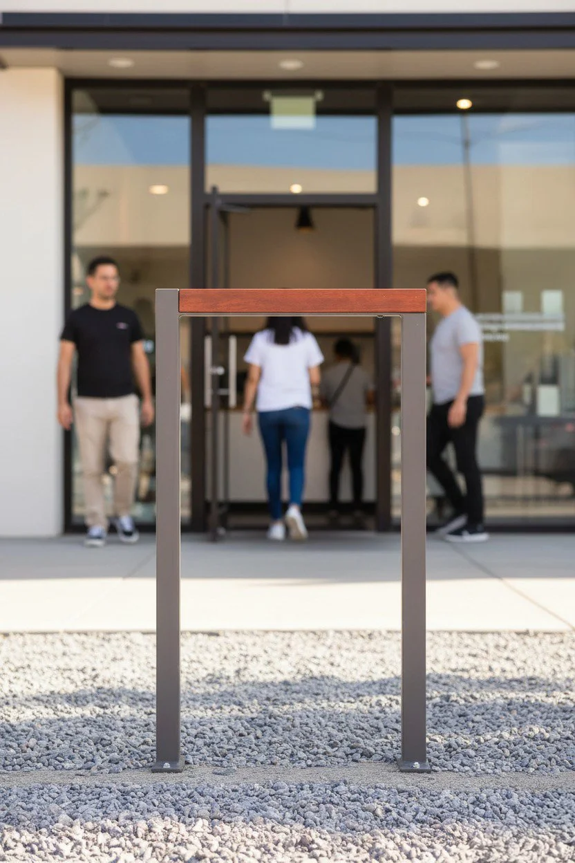 Esse discreto bicicletário em estrutura de aço tubular e detalhe em madeira comporta até duas bicicletas, fixação da trava se da no próprio tubo. Recomenda-se espaçamento de 75cm entre módulos.
