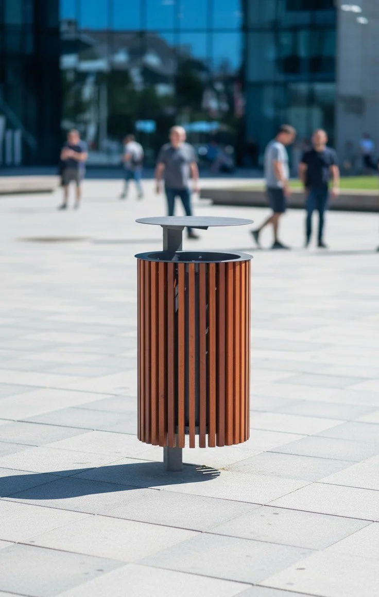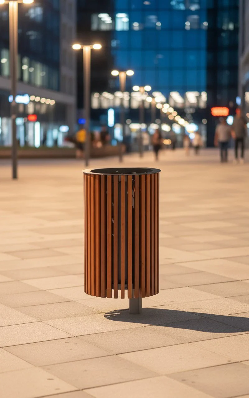Lixeira cilíndrica de 39cm de diâmetro. Confeccionada em aço e ripas verticais de madeira. Possui suporte interno para saco de lixo. Opção com ou sem tampa articulada.