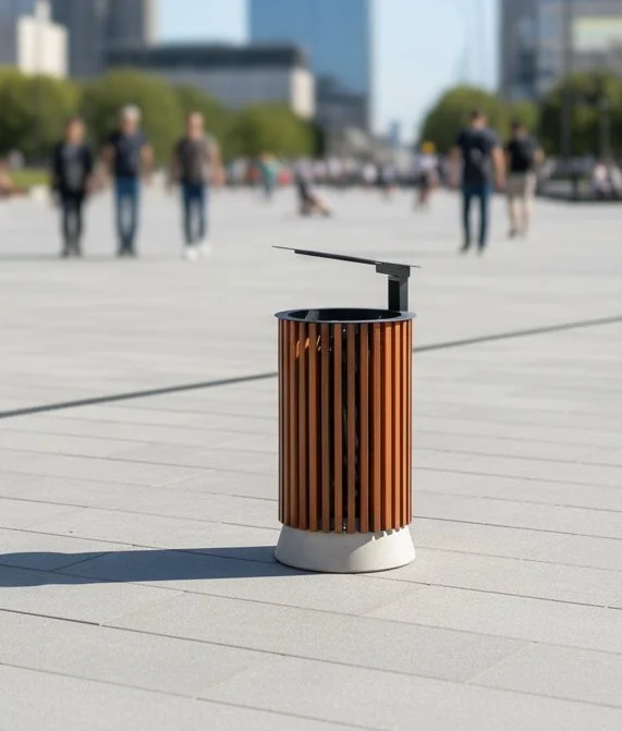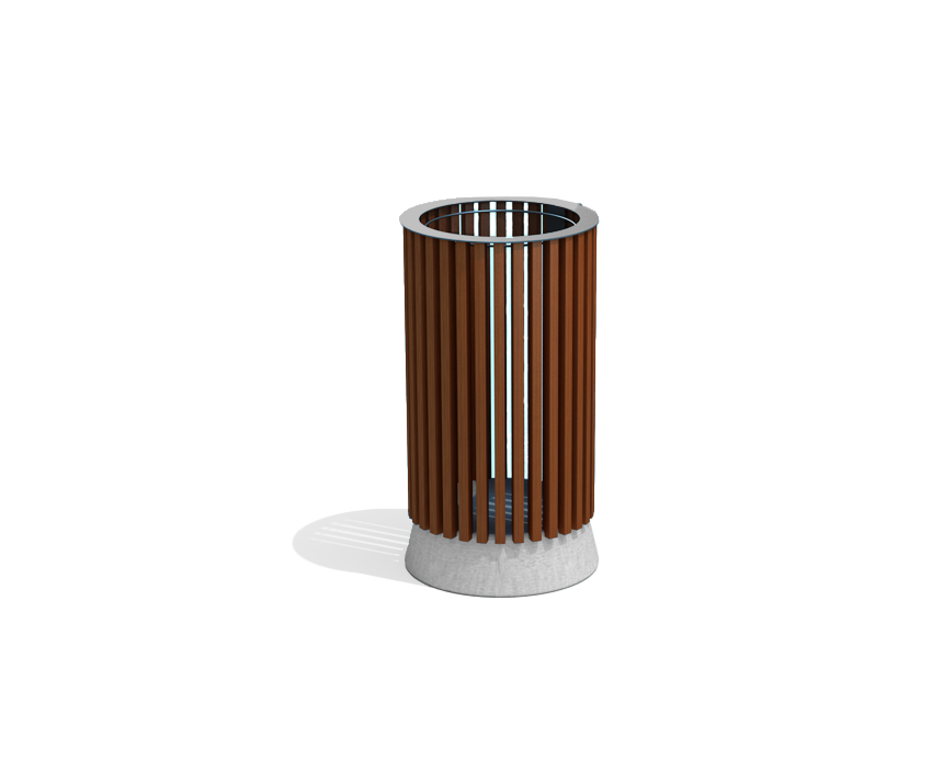 Lixeira cilíndrica. Confeccionada em aço e ripas verticais de madeira. Possui base de concreto, garantindo maior estabilidade e resistência. Conta com suporte interno para saco de lixo e está disponível nas versões com ou sem tampa articulada