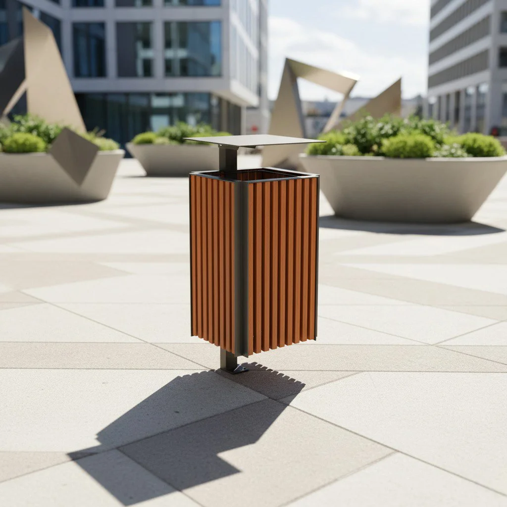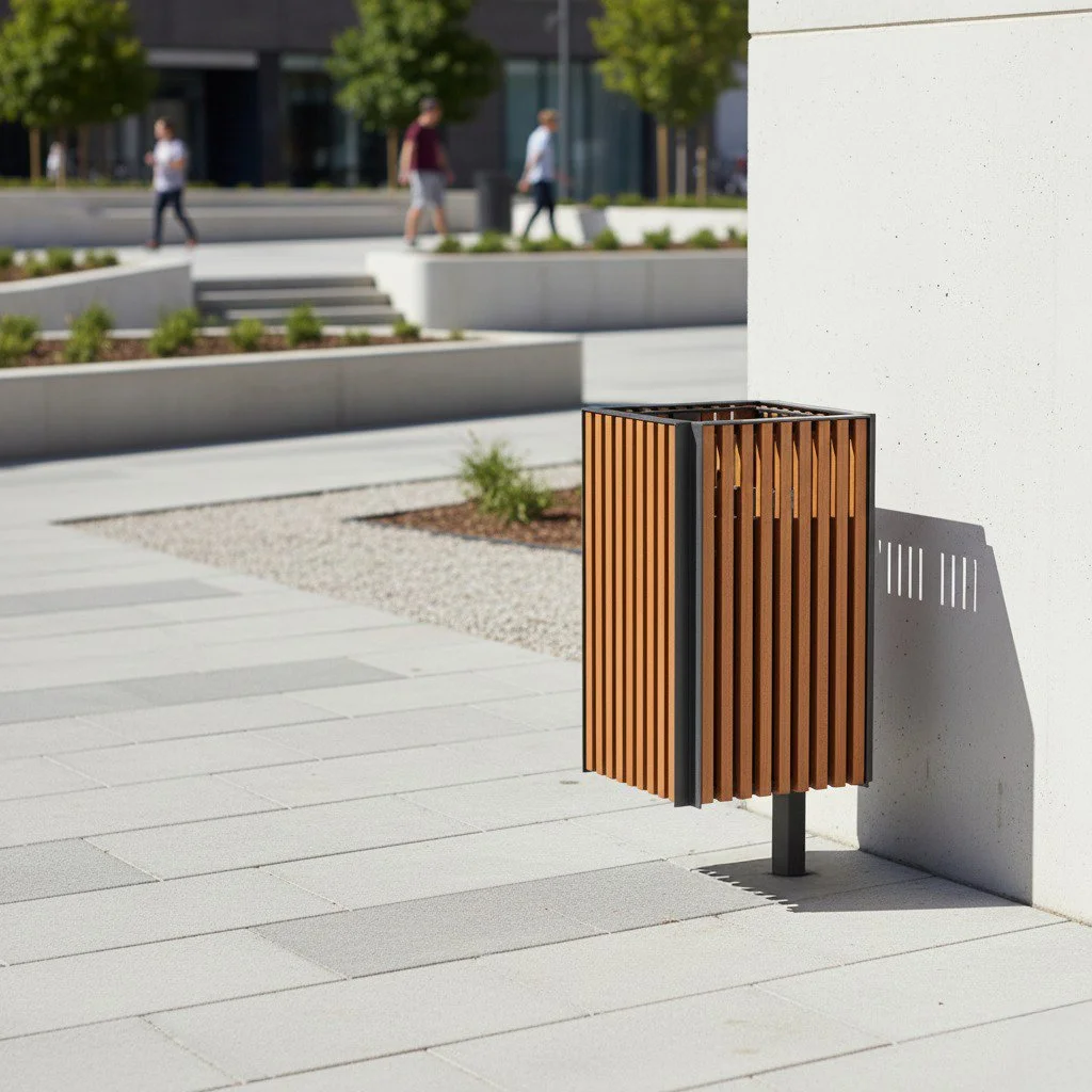 Confeccionada em aço e ripas verticais de madeira. Possui suporte interno para saco de lixo. Opção com ou sem tampa articulada.