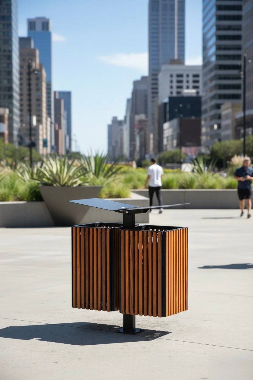 Lixeira quadrada dupla, perfeita para separação dos resíduos. Confeccionada em aço e ripas verticais de madeira. Possui suporte interno para saco de lixo. Opção com ou sem tampa articulada.