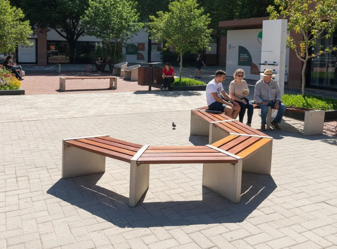 Banco em pés de concreto com assento em madeira. Seu formato possibilita diversas composições.