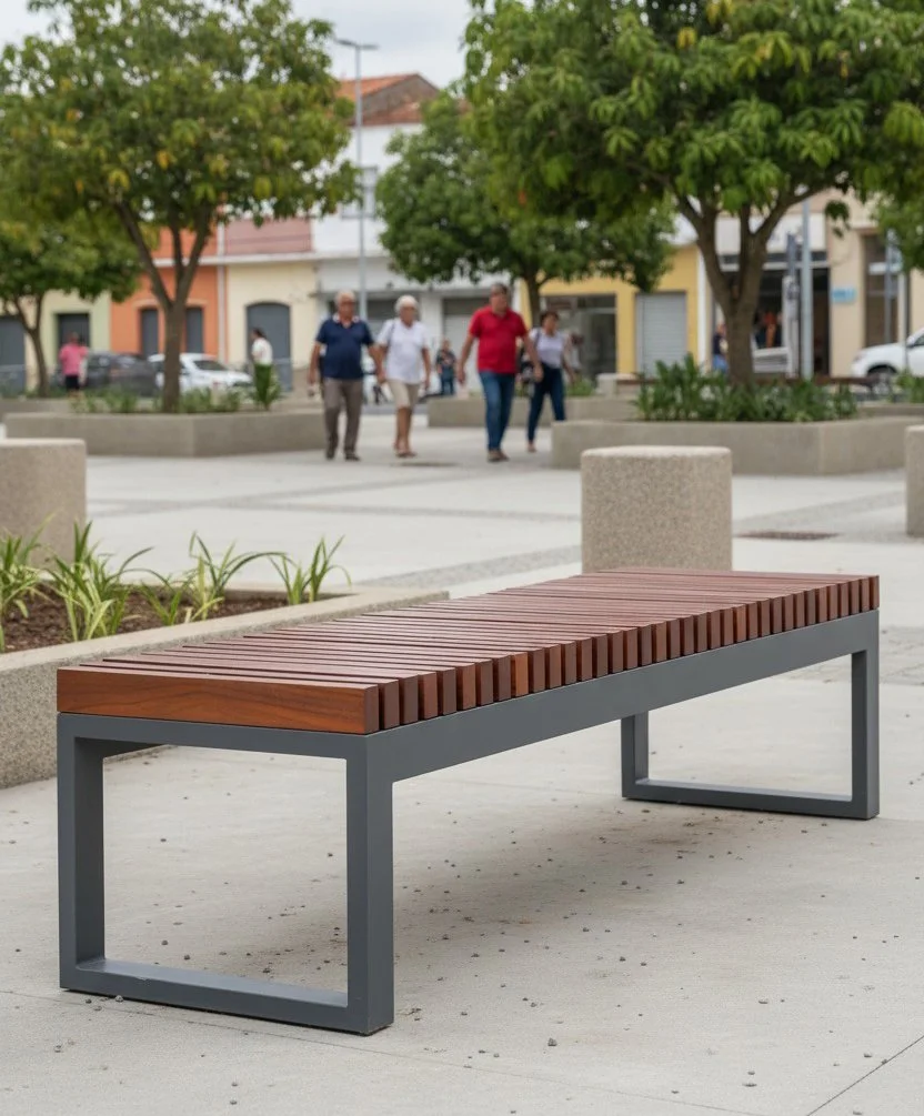 Proteção e Acabamento Aço zincado para proteção anti-corrosão. Acabamento em pintura a pó eletrostática. Madeira Jatobá com aplicação de verniz Cetol.